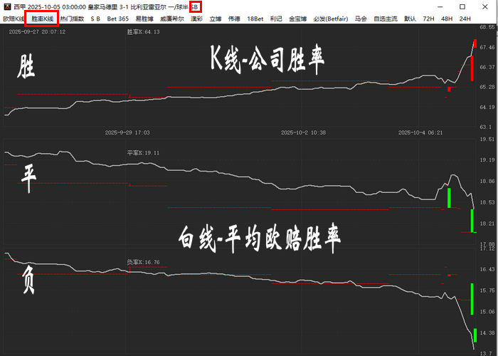 切换公司可以对比平均欧赔,白线是平均欧赔(或胜率),K线是公司欧赔(或胜率)。